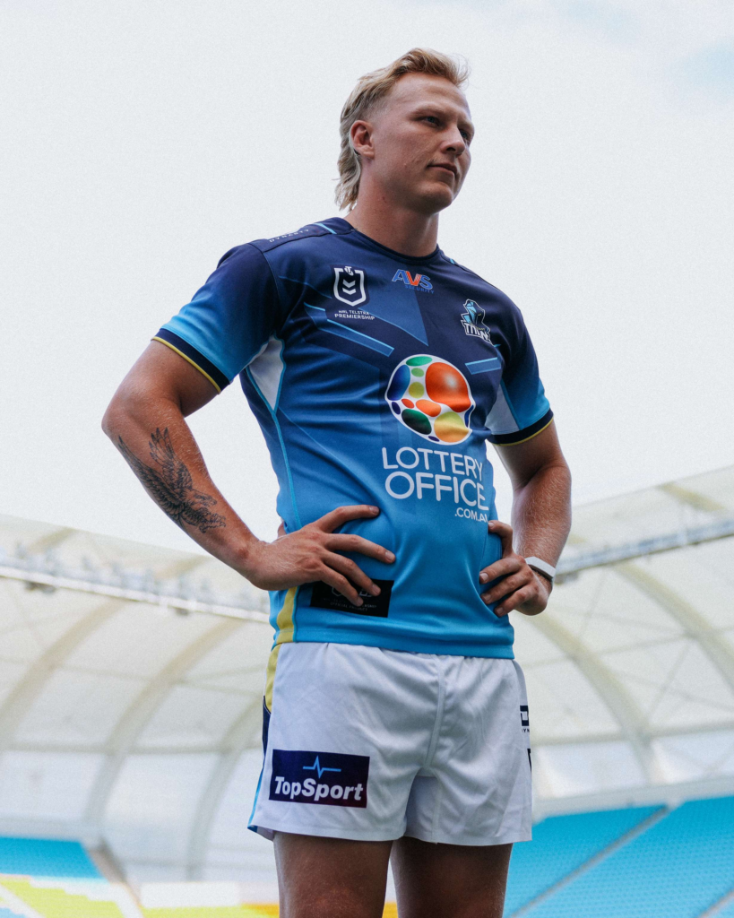 The Titans’ new home jersey is underwhelming. While there’s plenty of blue, there’s almost no gold, and a little bit of white under the armpits. And the colourful Lottery Office logo stands out way too much. The away jersey is unchanged.