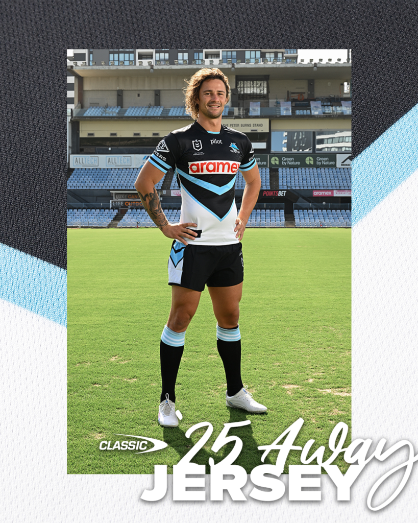 The Sharks have kept their traditional home jersey, while the away jersey is a combination of their Super League jersey and the black alternative design they’ve worn regularly.