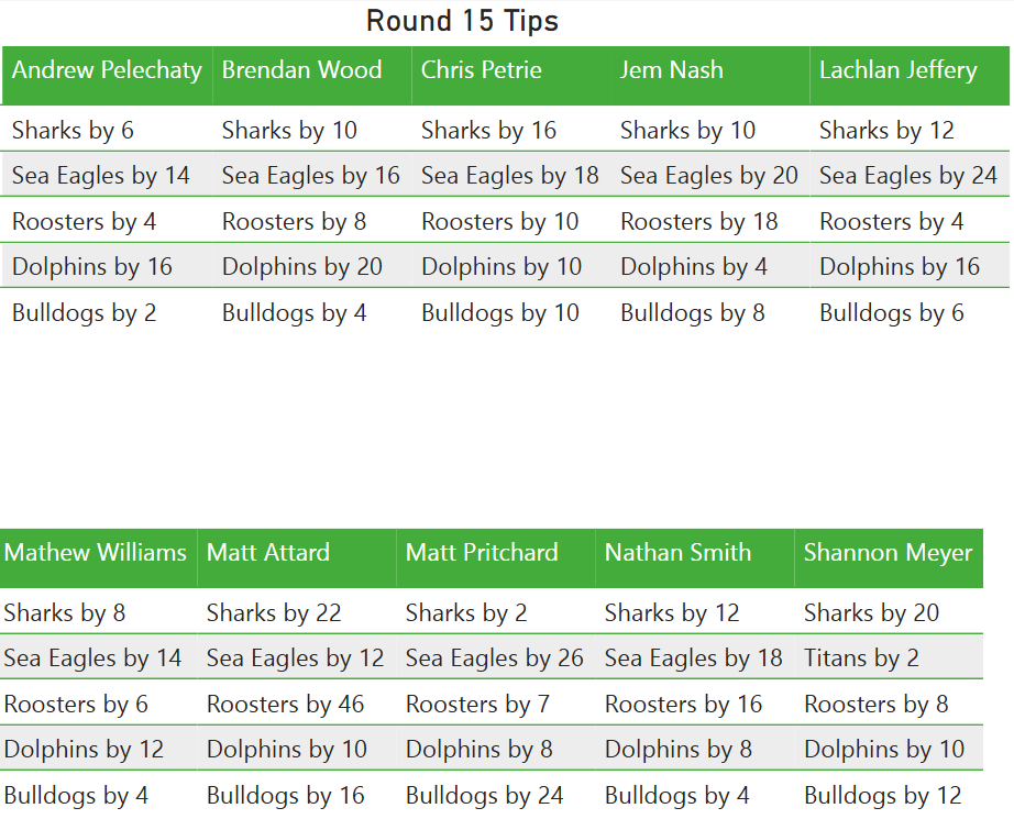 Check out who our writers think will win in round 15 of the 2025 NRL season.